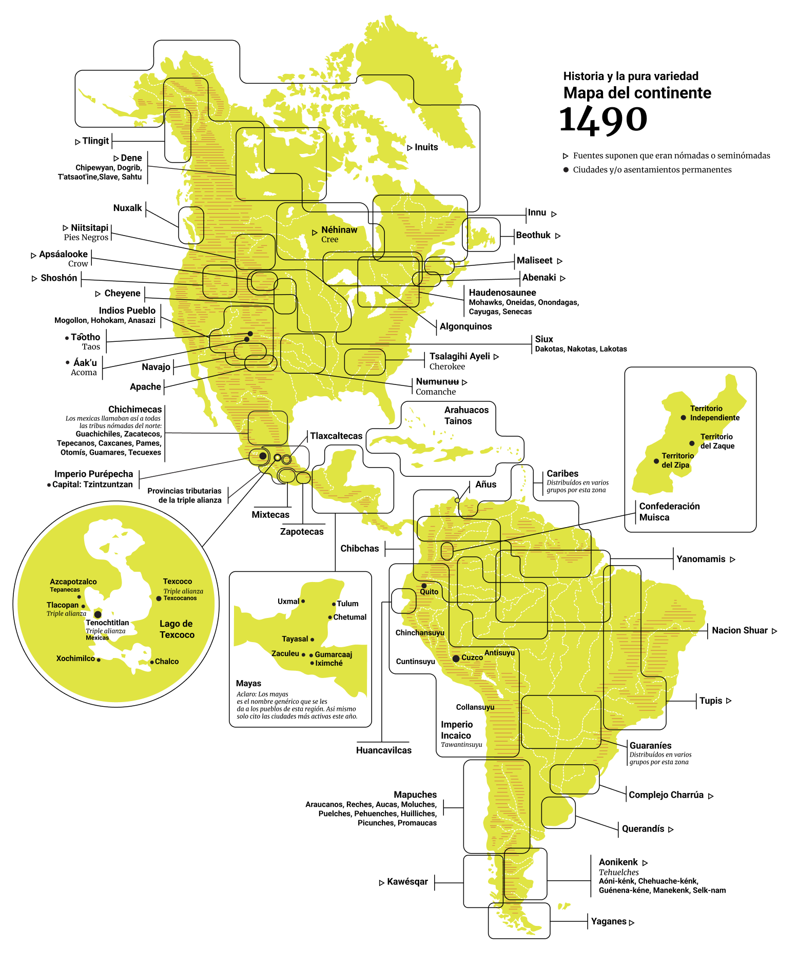 Este mapa tiene como propósito dar un vistazo rápido de cómo era el continente antes de la llegada de los europeos, y para dar una pequeña muestra de la diversidad y cantidad de culturas maravillosas que existían en el continente ántes del genocidio.