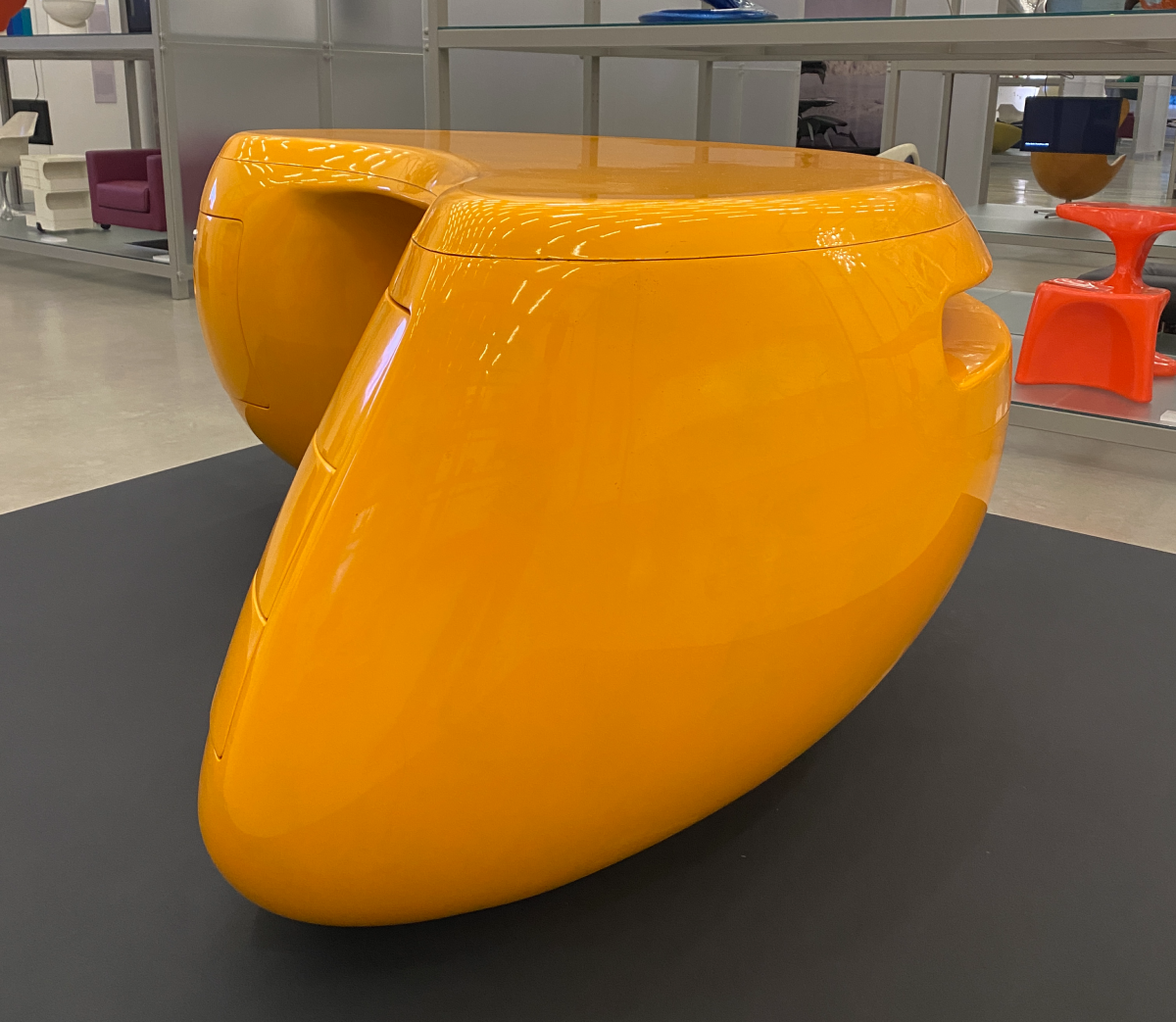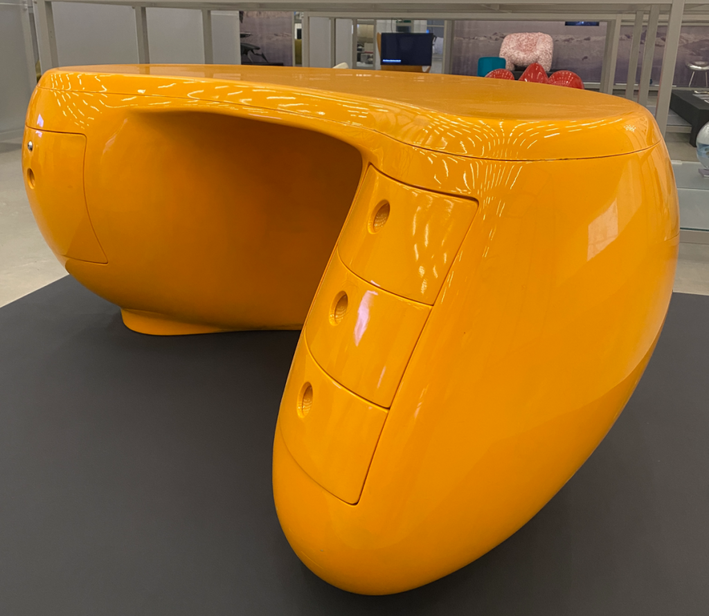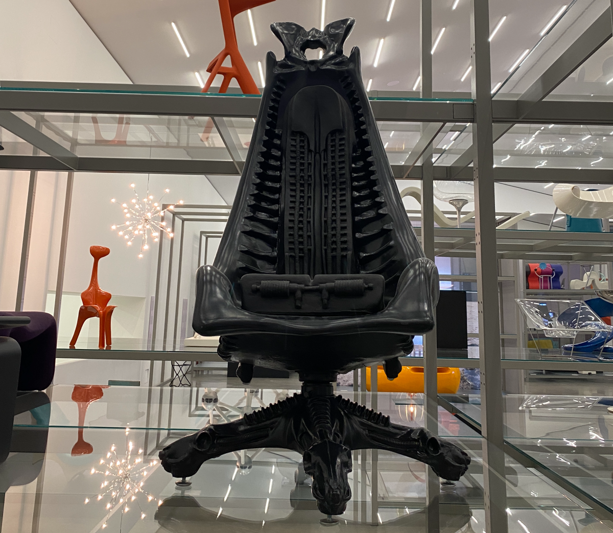 Había una colección de muebles futuristas y acá les dejo unos highlights. El escritorio boomerang de Maurice Calka (Porque obvio soy un sucker de las cosas brillantes de color yema de huevo) y la silla huesuda de HR Gigger